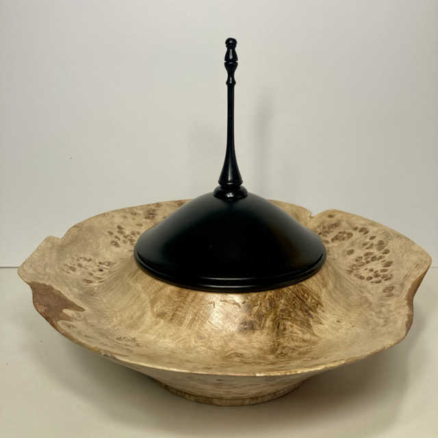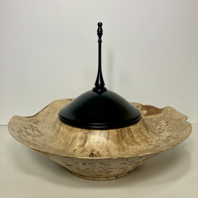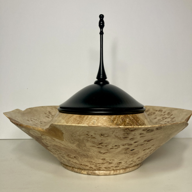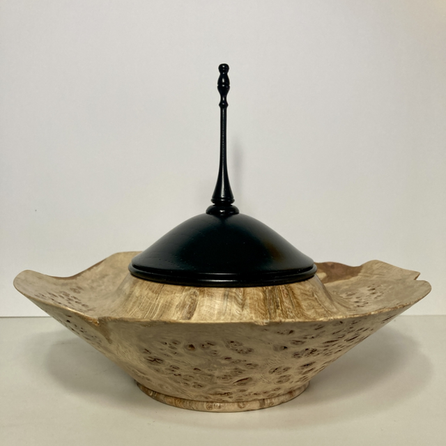 Lathe turned English oak finial pot with ebonised lid, food safe. 9” diameter x 7.5” high.