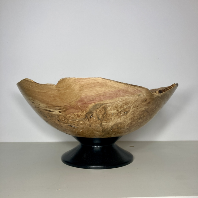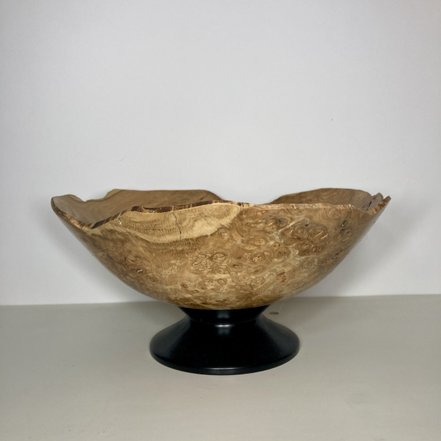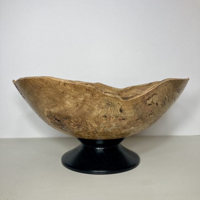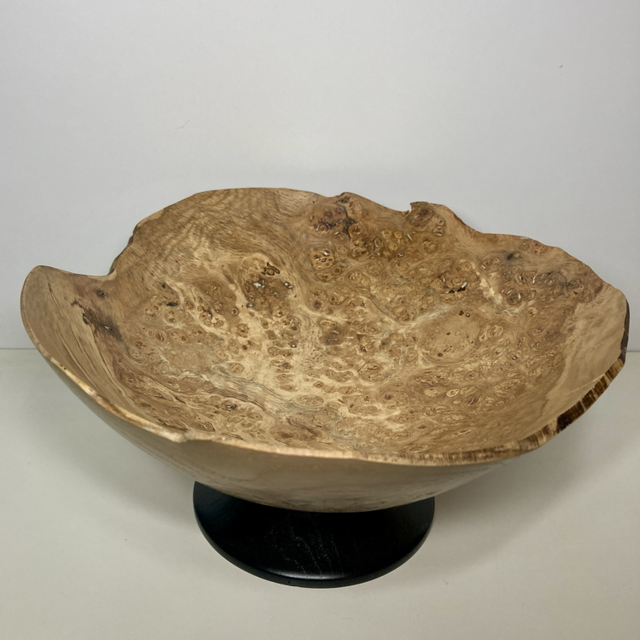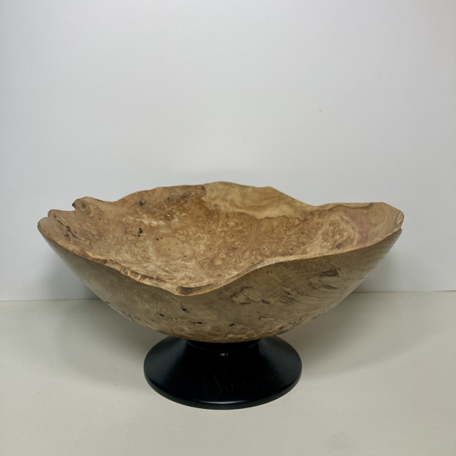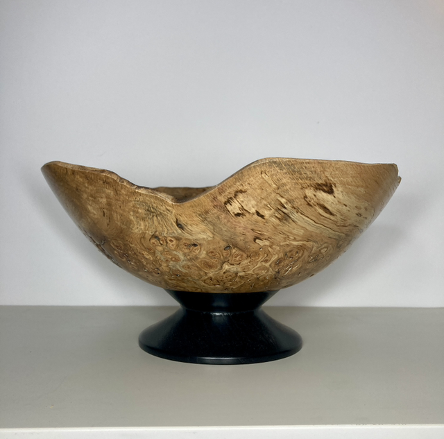 Lathe turned English oak burr bowl, ebonised foot. 9” diameter x 4” high. Food safe.