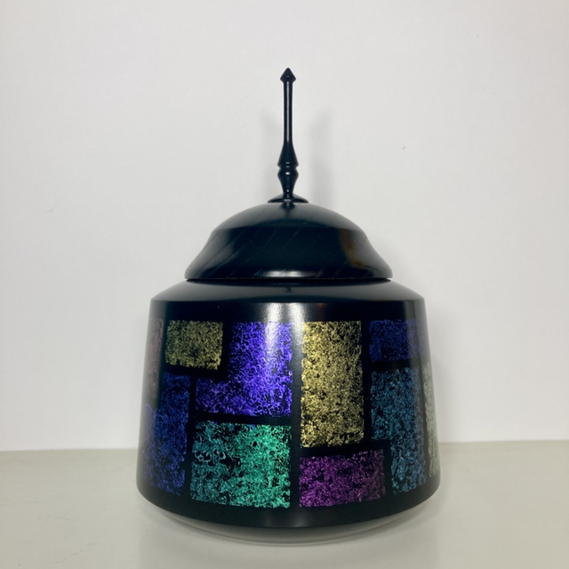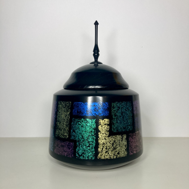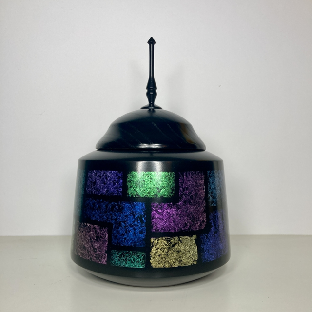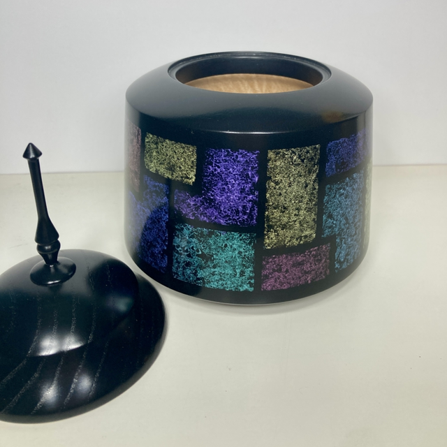 Lathe turned sycamore finial pot with hand painted iridescent design. 5” diameter x 7.5” high