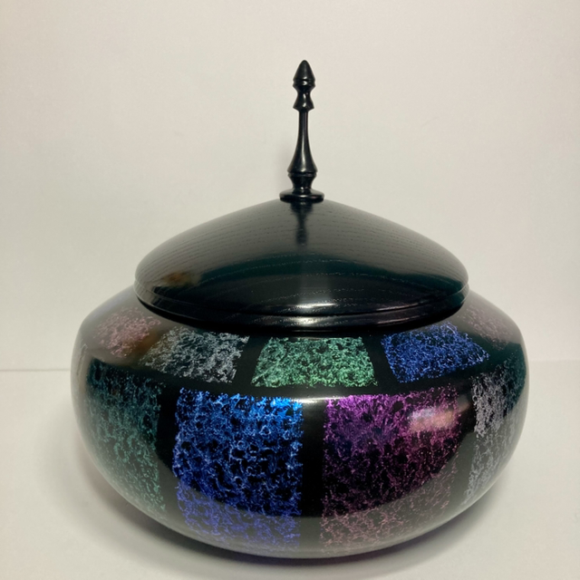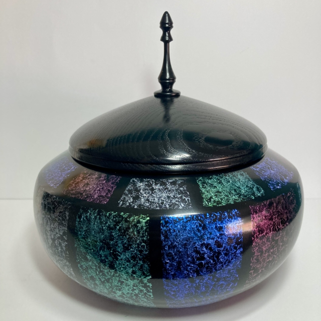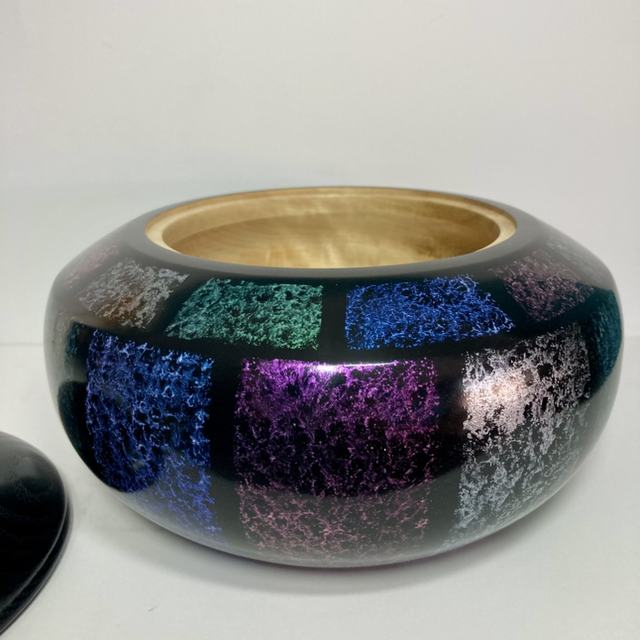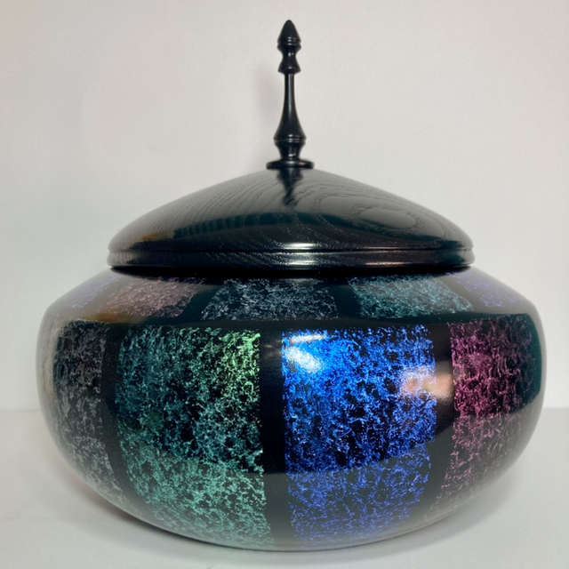 Lathe turned tulip wood finial pot with hand painted iridescent design.