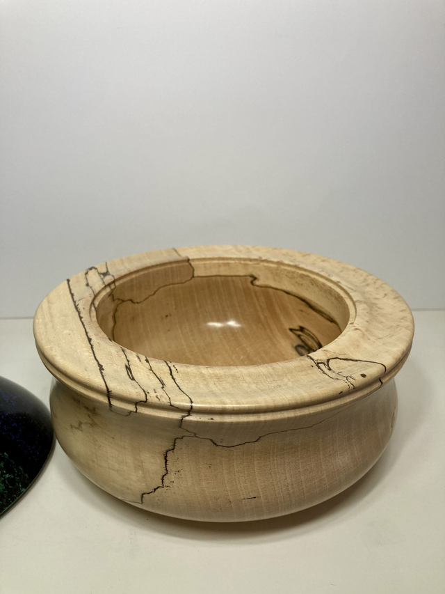 lathe turned spalted beech finial pot with hand painted iridescent lid and ebonised finial.