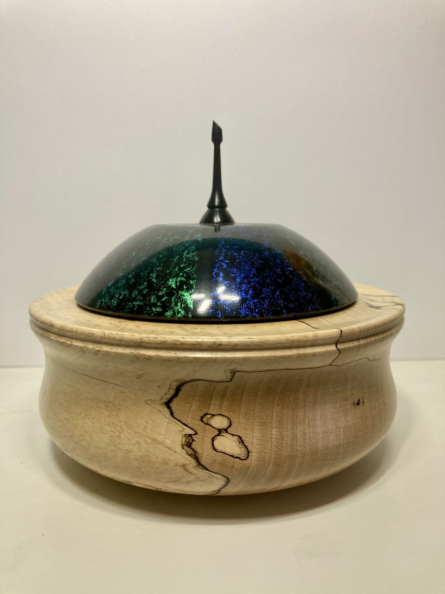 Spalted beech finial pot with hand painted iridescent lid