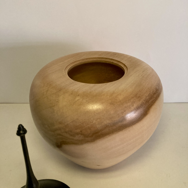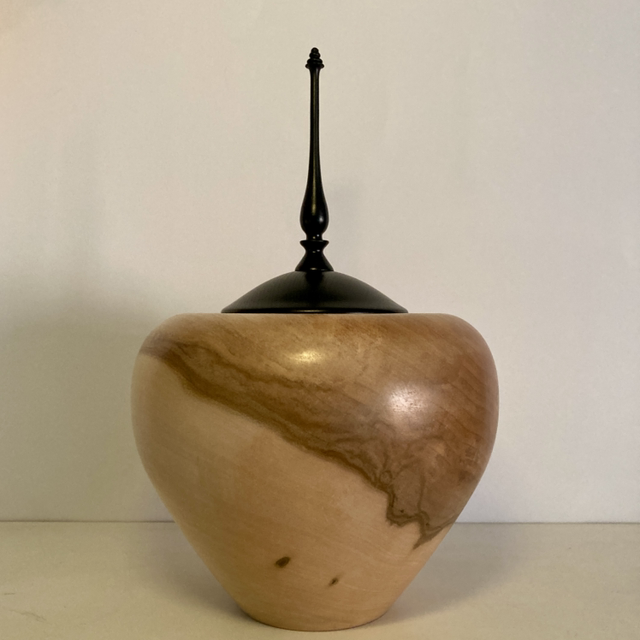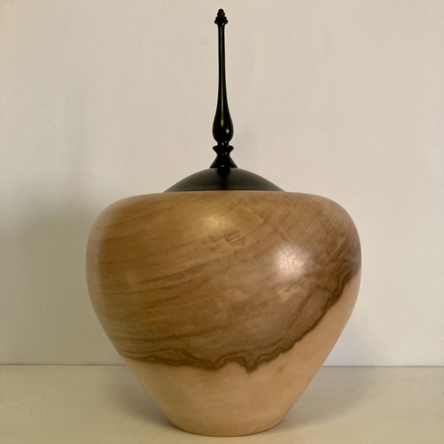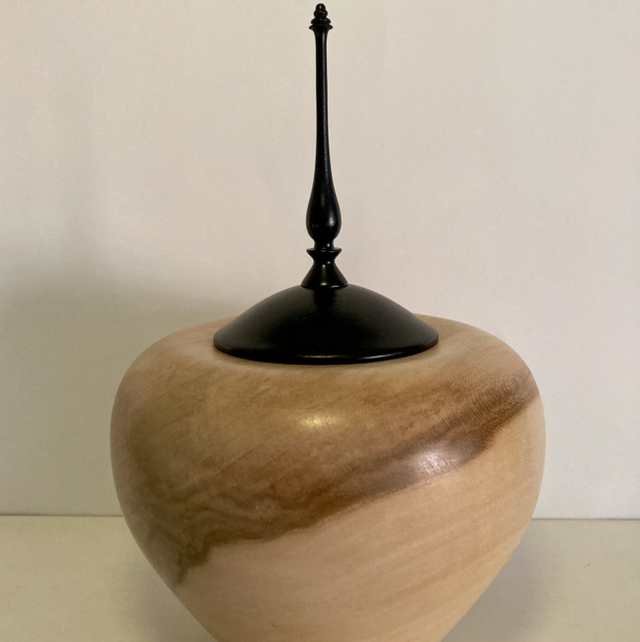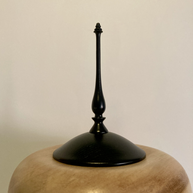Lathe turned two tone sycamore finial pot with ebonised lid.