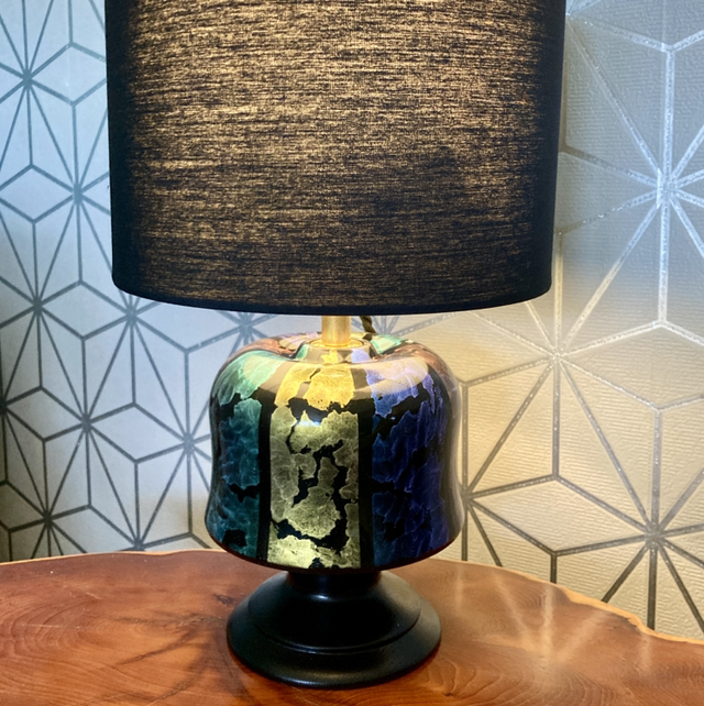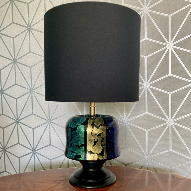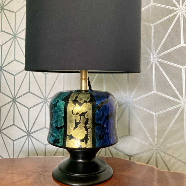 Lathe turned wood lamp with iridescent hand painted finish, brass light fitting and black lampshade. PAT tested.